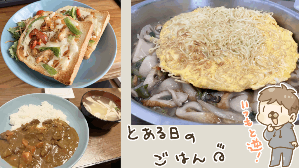 ピザトースト、あんかけソバ、カレーでごはん