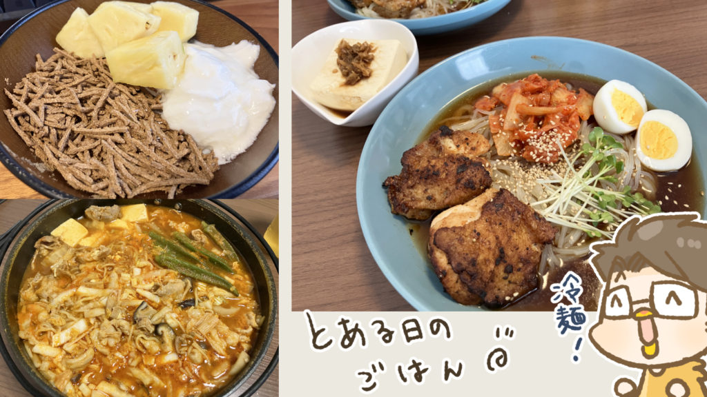 寄るご飯は、盛岡冷麺+チキンステーキ、キムチ、ゆで卵、豆腐でした。