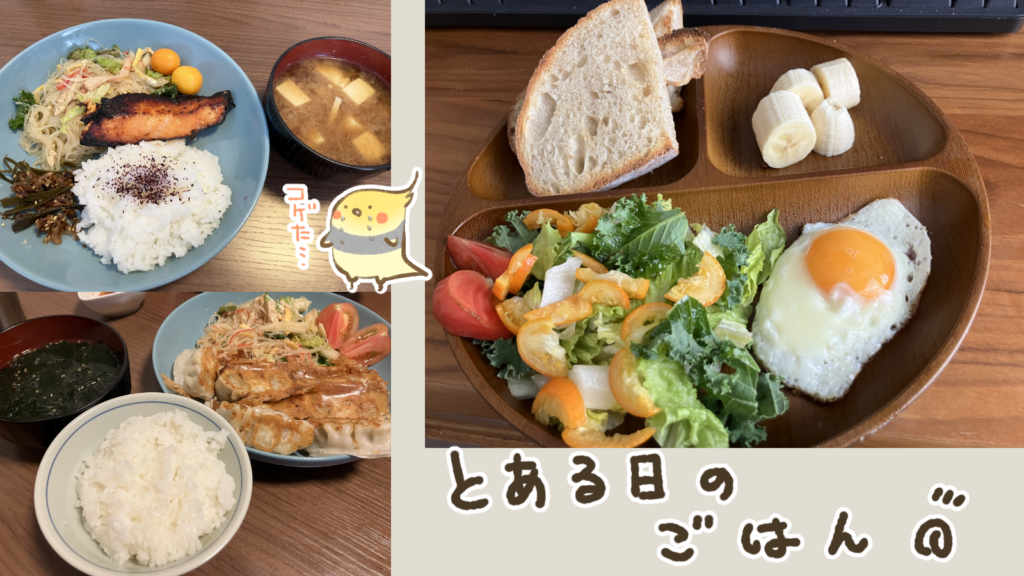 夜ご飯は、冷凍餃子、春雨サラダ、わかめスープ、白米でした。