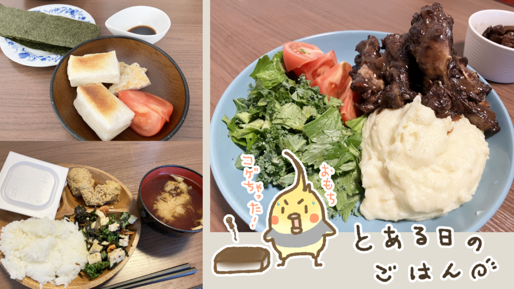 焼き餅、手羽元のワイン煮、真子の煮付けでごはん